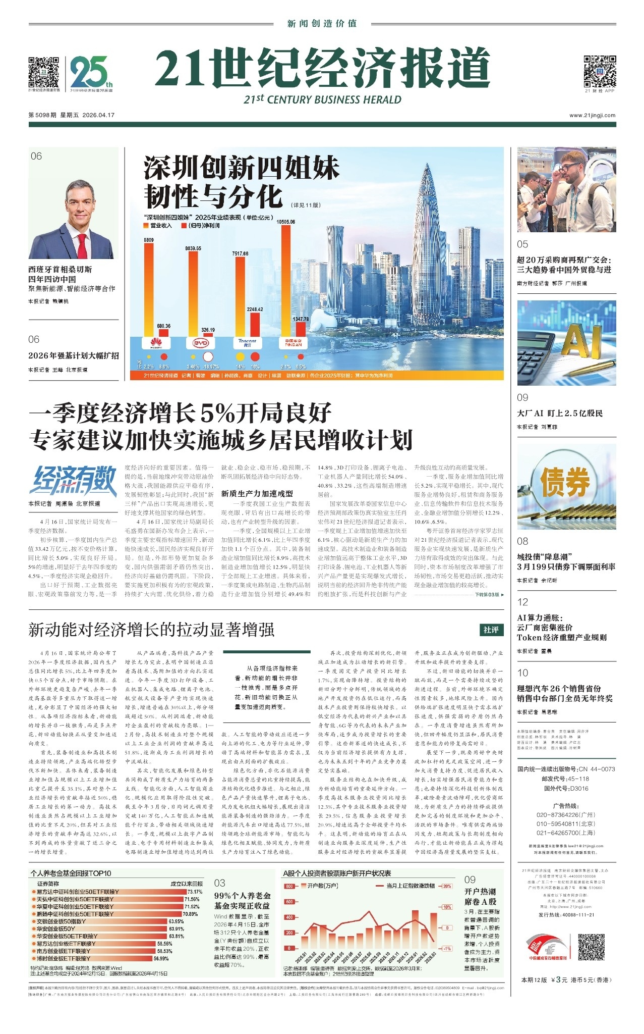 4月16日,国家统计局公布了2026年一季度经济数据,国内生产总值同比增长5%,比上年四季度加快0.5个百分点,好于市场预期。在外部环境更趋复杂严峻、去年一季度